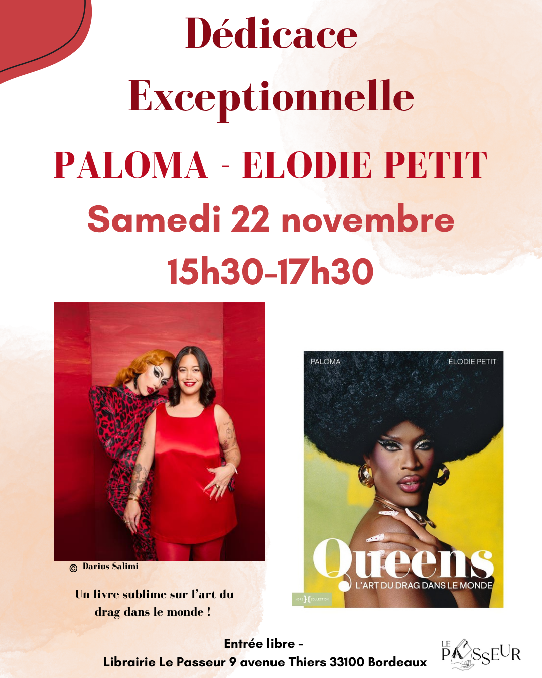 Evènement exceptionnel, nous avons le plaisir d’accueillir Elodie Petit, et Paloma la Queen de la première saison de Drag Race France pour une dédicace exceptionnelle de leur livre : Queens, l’art du drag dans le monde.